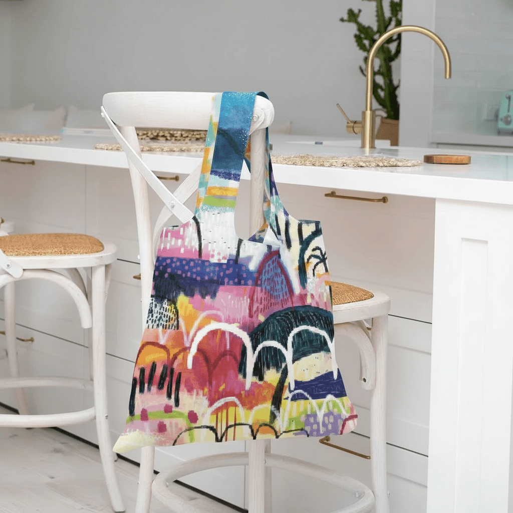 Add a joyful burst of colour to every outing with the Sunday Stroll Reusable Shopping Bag. Overflowing with vibrant pinks, lush greens, rich blues, and playful brushstrokes, this design by Australian artist Lisa Perruzza captures the magic of wandering through a dreamlike landscape — where imagination runs wild and every corner is alive with movement.